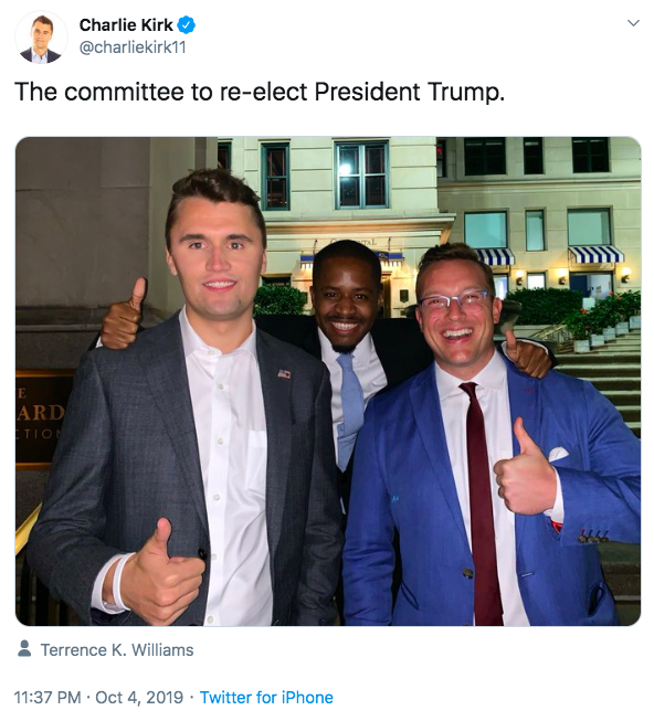 On Friday, the day that Trump addressed the Black Leadership Summit at the White House, Kirk tweeted a photo of himself, TPUSA chief creative officer Benny Johnson, and conservative comedian Terrence J. Williams with the caption, “The committee to re-elect President Trump.” The photo was taken on Oct. 4, during TPUSA’s three-day Black Leadership Summit, which took place from Oct. 3 to Oct. 5. Trump addressed the conference at a White House event that day.