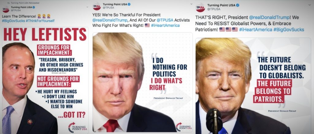 TPUSA, which has been a cheerleader for Trump and his family for several years, also boosts Trump online. In recent days, TPUSA has tweeted and retweeted multiple posts attacking Rep. Adam Schiff (D-Calif.), the chair of the House Intelligence Committee, over his role in the House’s impeachment inquiry.