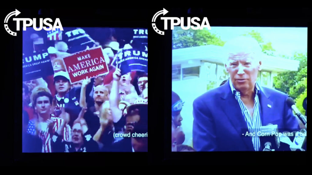 TPUSA played an intro video at the start of the session, featuring footage of Trump and black Americans including Kanye West praising him. After a scene of a Trump rally, the film shifts to a clip of Joe Biden telling his “Corn Pop” story, clearly throwing a jab at the former vice president.