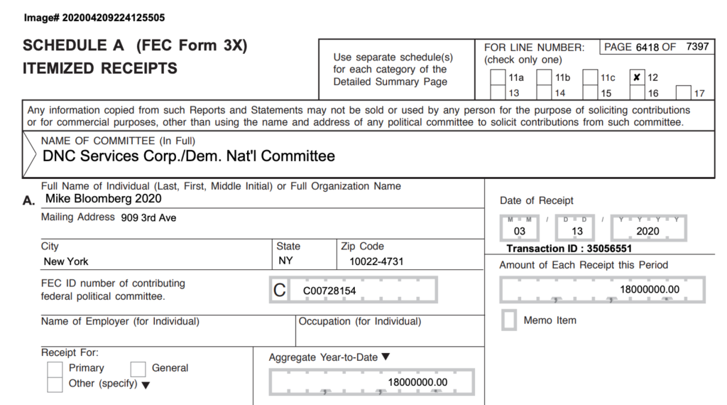 On March 13, after suspending his presidential campaign, the former New York City mayor transferred $18 million from his campaign to the Democratic National Committee to back its organizing push in 12 battleground states.