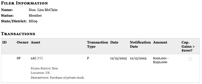 According to a financial transaction disclosure, Michigan Rep. Lisa McClain’s husband purchased between $100,001 and $250,000 in private stock of xAI on December 15, 2025. McClain is the chairwoman of the House Republican Conference and has repeatedly appeared alongside President Trump and senior administration officials at meetings and policy announcements, including a Dec. 3 White House event, shortly before the stock purchase, where she joined Trump for a public announcement on lowering car costs.